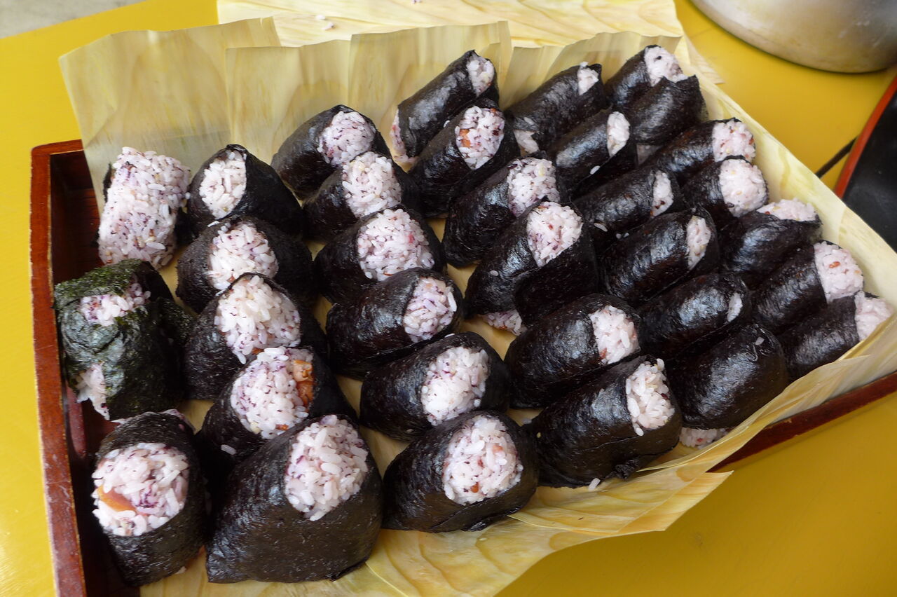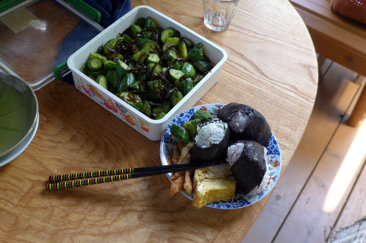 ❶ 8月22日(火)お昼ごはん 泰心工房での木工ワークショップの中休みを兼ね、地産地消雑穀入りおにぎりランチを堪能。たっぷり用意された卵焼き、きゅうりの漬物、はりはり漬け、うめぼしなどを堪能。冷たく用意された麦茶も大好評。