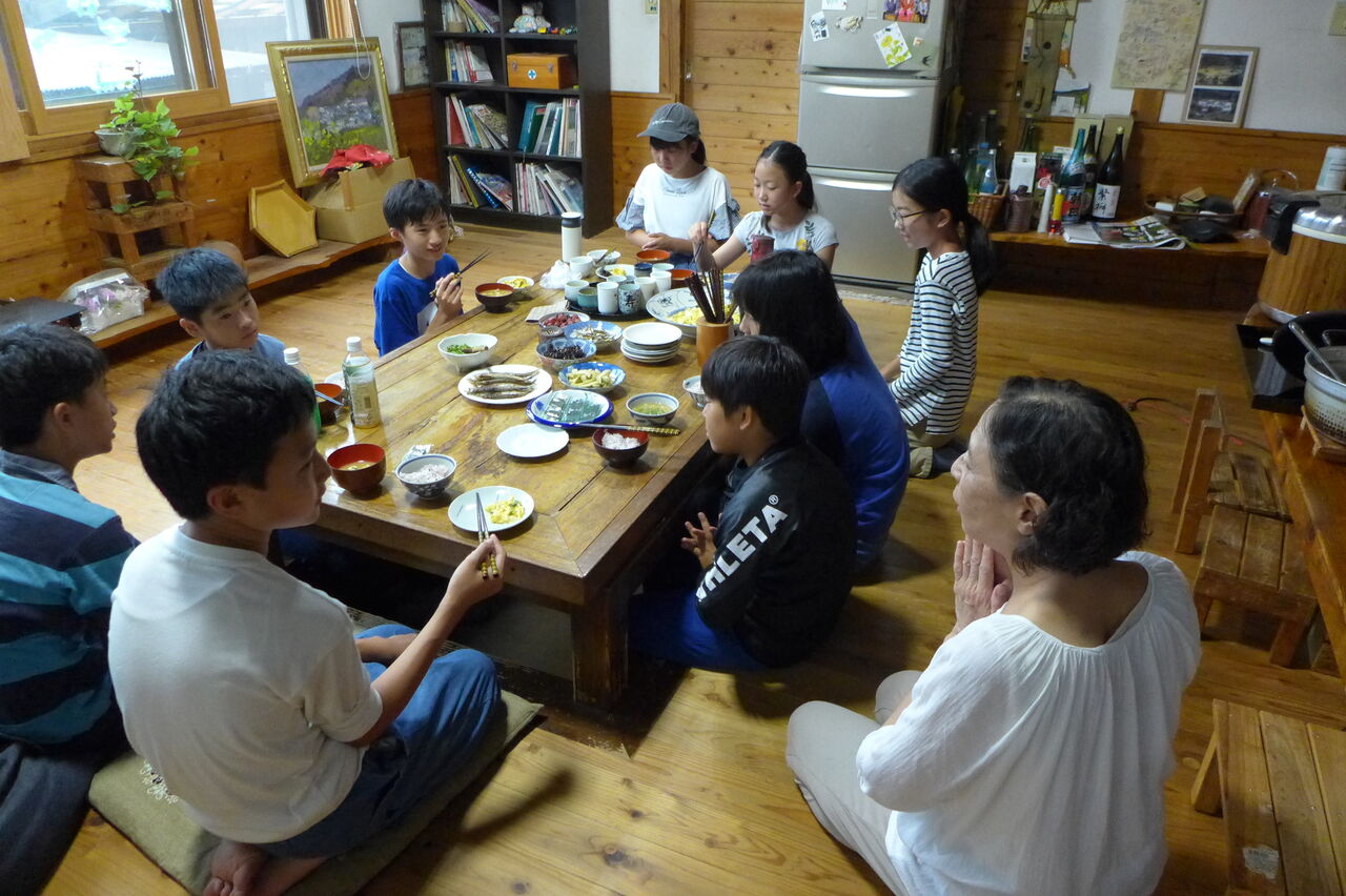 ❸ 8月23日(水)朝ご飯 ししゃも、野菜入りスクランブルエッグ、ふんだんな野菜の漬物、野菜たっぷりお味噌汁、自家製米による雑穀入りご飯。食べ終わったあとは自分たちで食器洗いと片付けをすすんで行う。