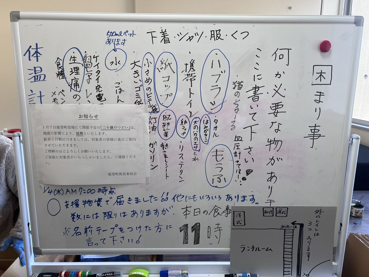 ・避難所の避難者に人を尋ねたところ「名古屋から帰省していたのでわからない」と話されました。避難者の中には、正月に合わせた帰省者もいるため、帰宅可能になれば避難者数は減っていく可能性があるが、倒壊家屋も多いため、中長期的な避難生活が必要になる方が多い。