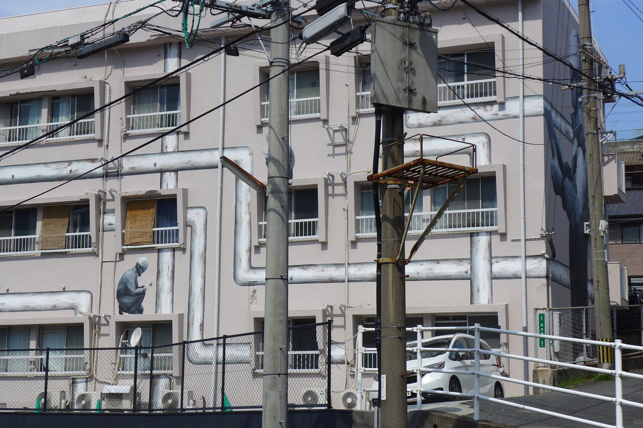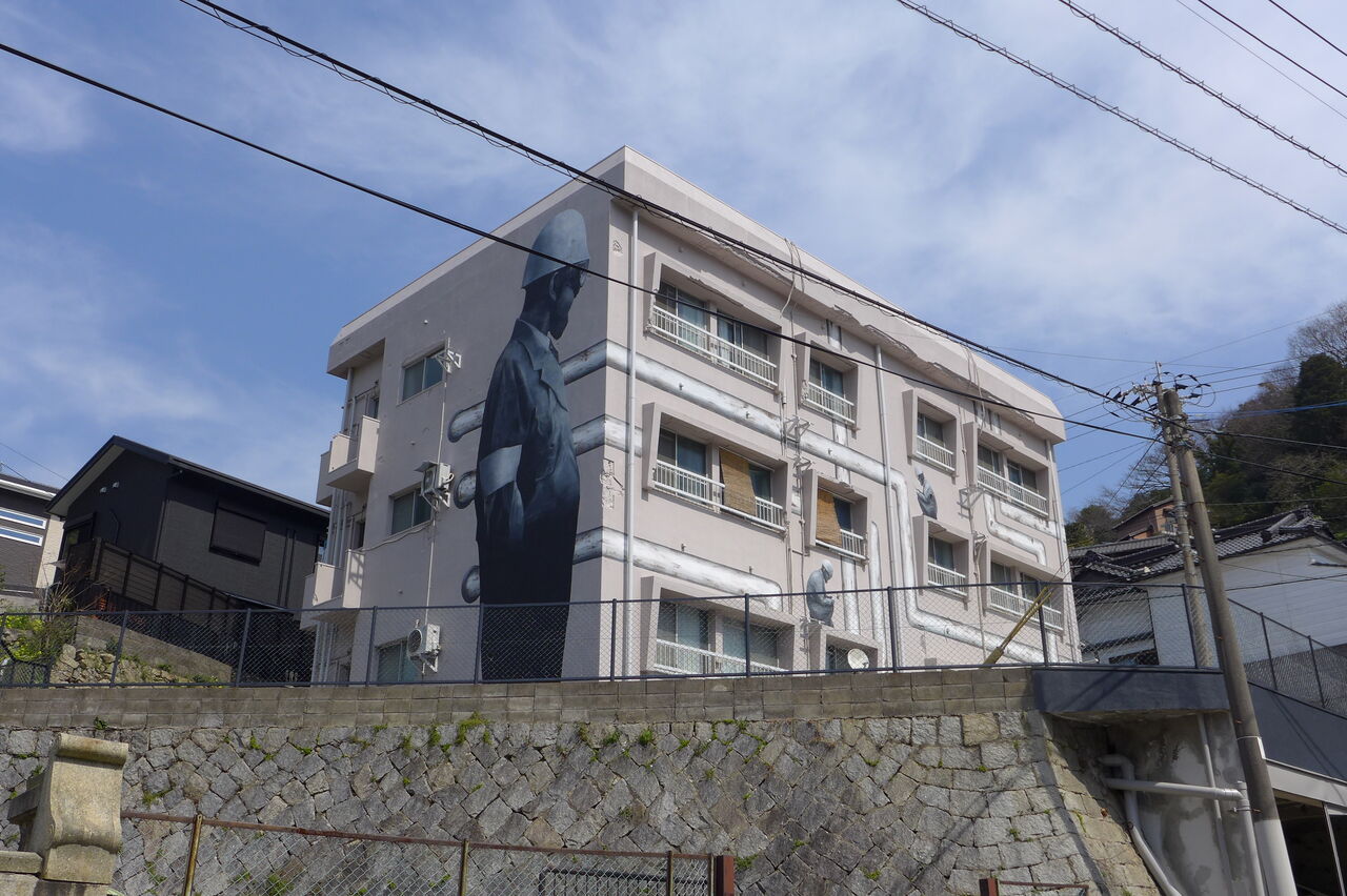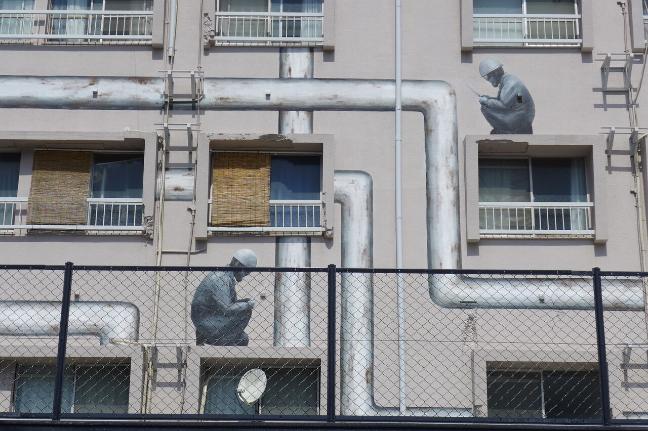 20240316門司の壁画ビル、働くヘルメット姿に見惚れる « Older