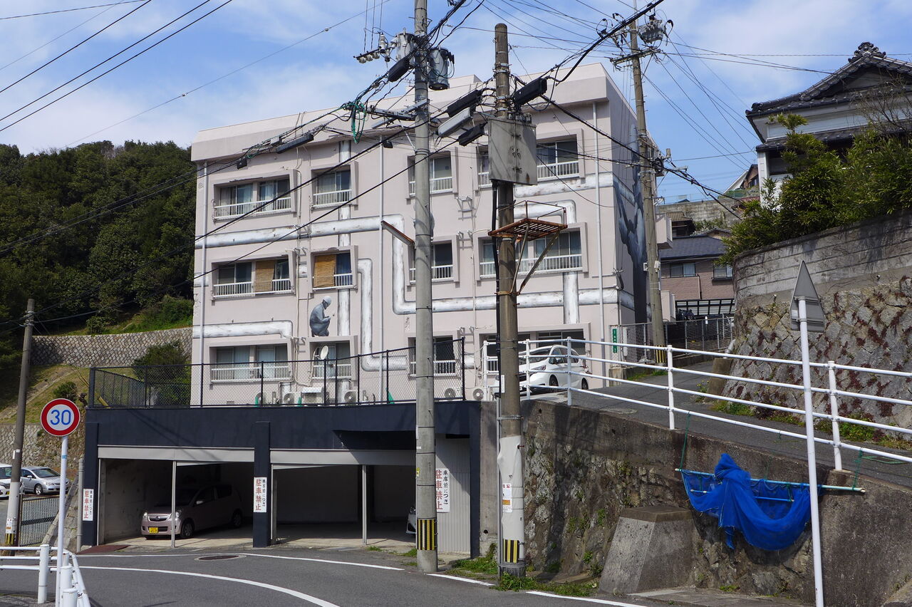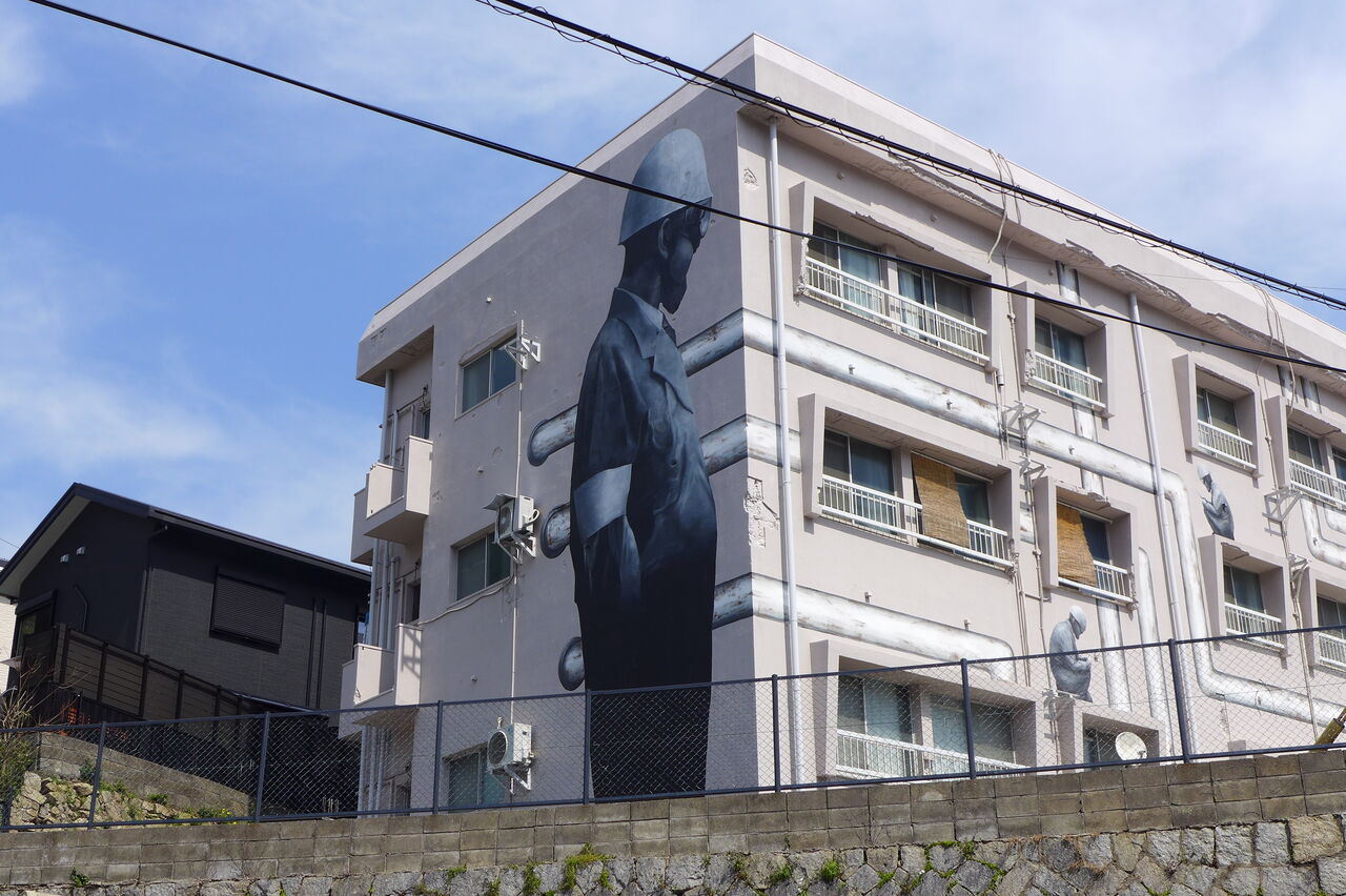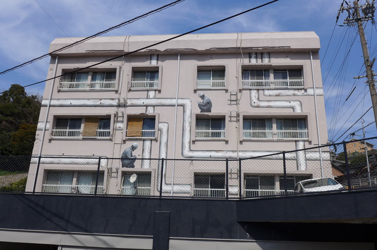 20240316門司の壁画ビル、働くヘルメット姿に見惚れる « Older