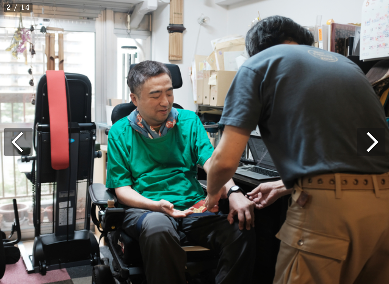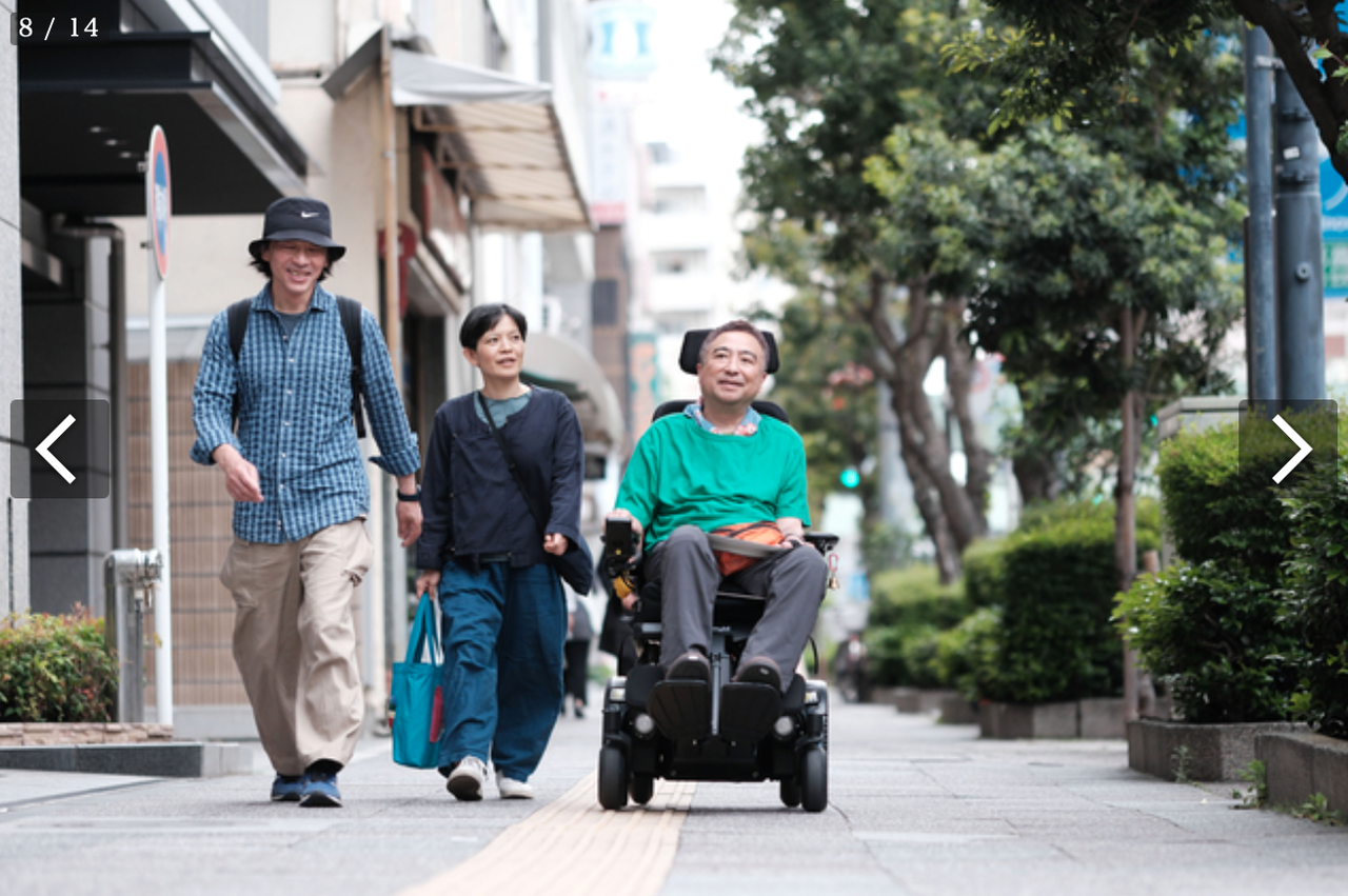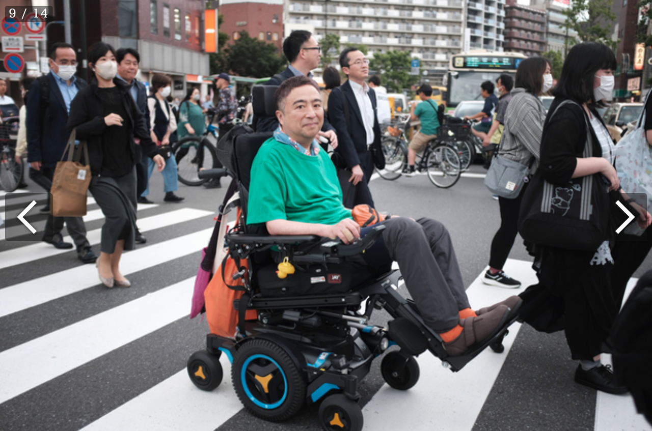 車いすに乗って電車通勤し、積極的に街に出る。子どもたちがじっと車いすを見つめていると「かっこいいでしょ」、若いカップルには「重いから手伝って」と声をかける。「僕を教材にして、困ったときは頼っていいんだよ、と伝えたい」