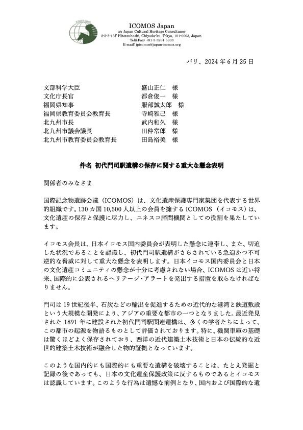 20240626西日本新聞 初代門司駅遺構に「重大な懸念」イコモス会長が異例の緊急声明 北九州市の計画見直し要請「変更なしなら『ヘリテージ・アラート』」