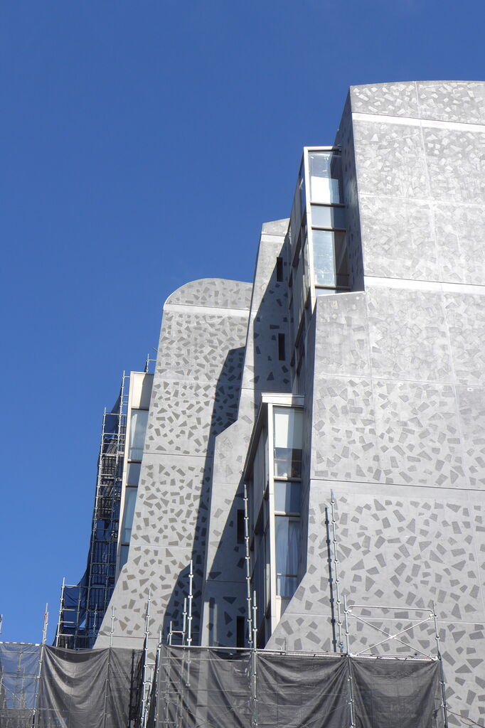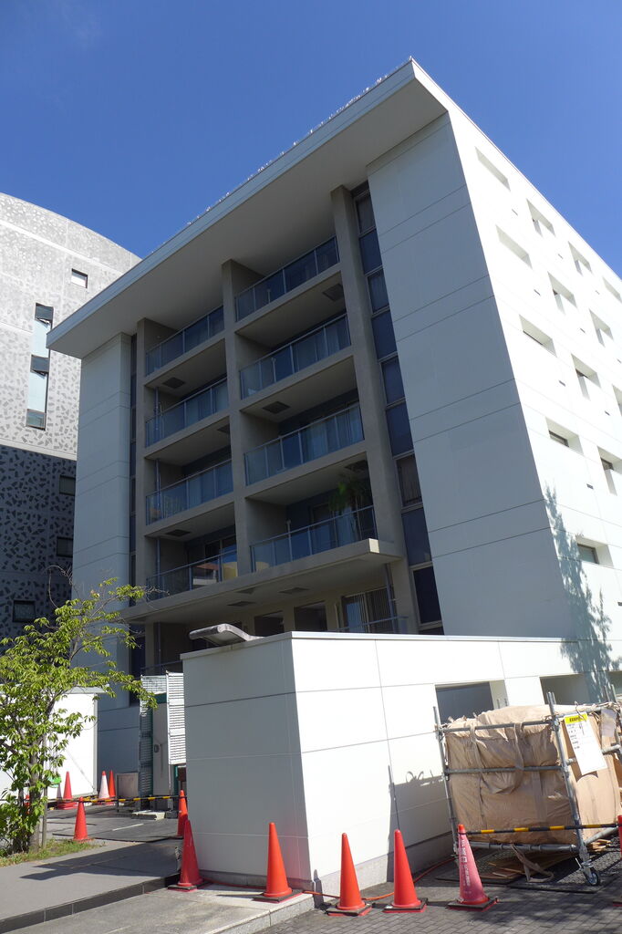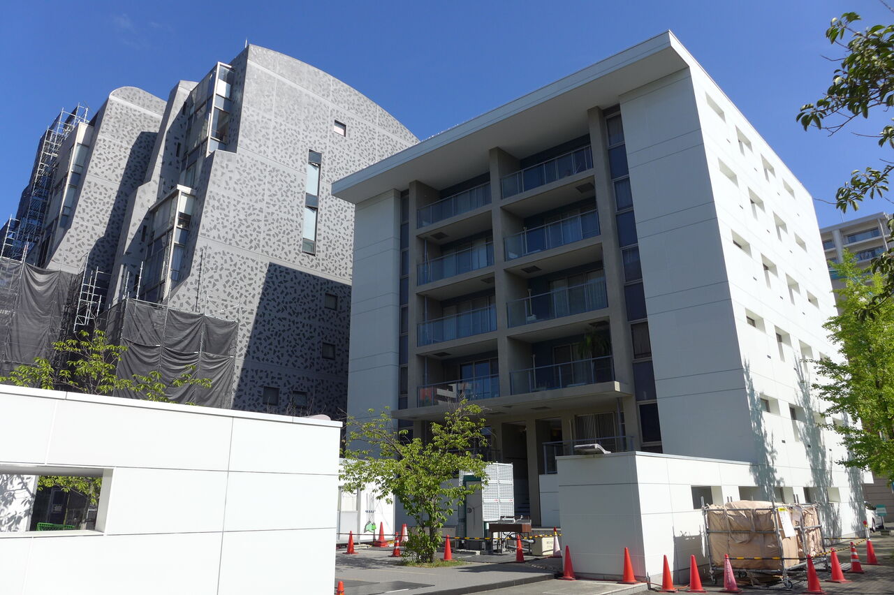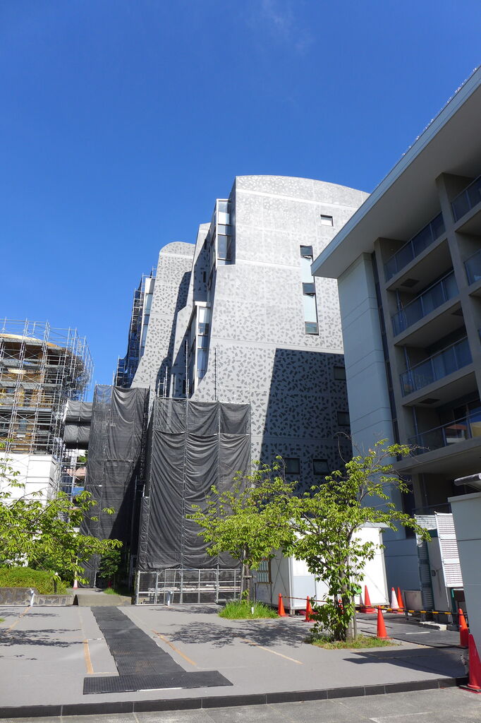 20240812朝日で香椎浜ネクサスワールド・ポルザンパルク棟の改修白壁が光り輝く!