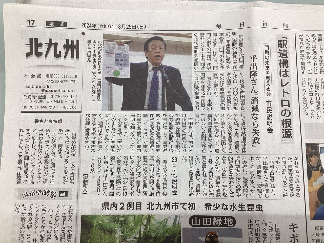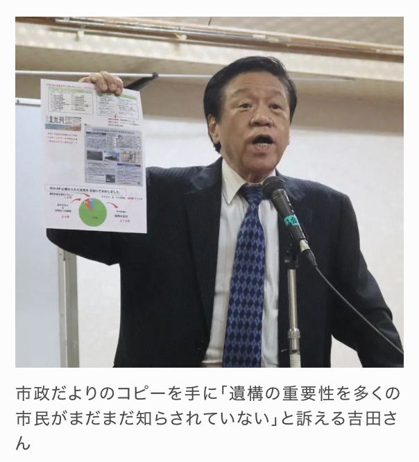 吉田さんは、市が8月15日号の市政だよりで現地に計画する複合公共施設の説明に1ページを割いた一方、国史跡級とされる遺構の重要性や国際記念物遺跡会議(イコモス)が重大な懸念を表明した緊急声明に触れなかったことを批判した。