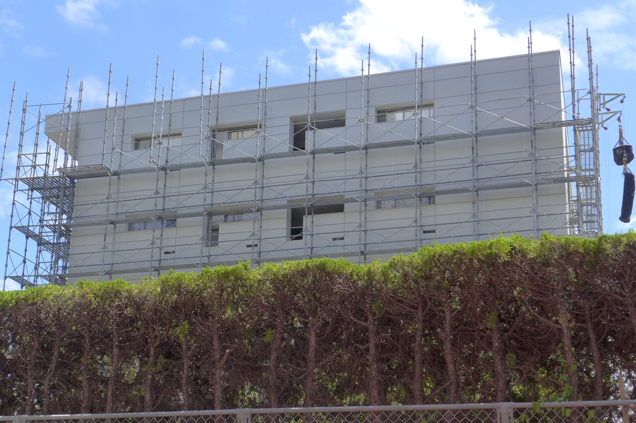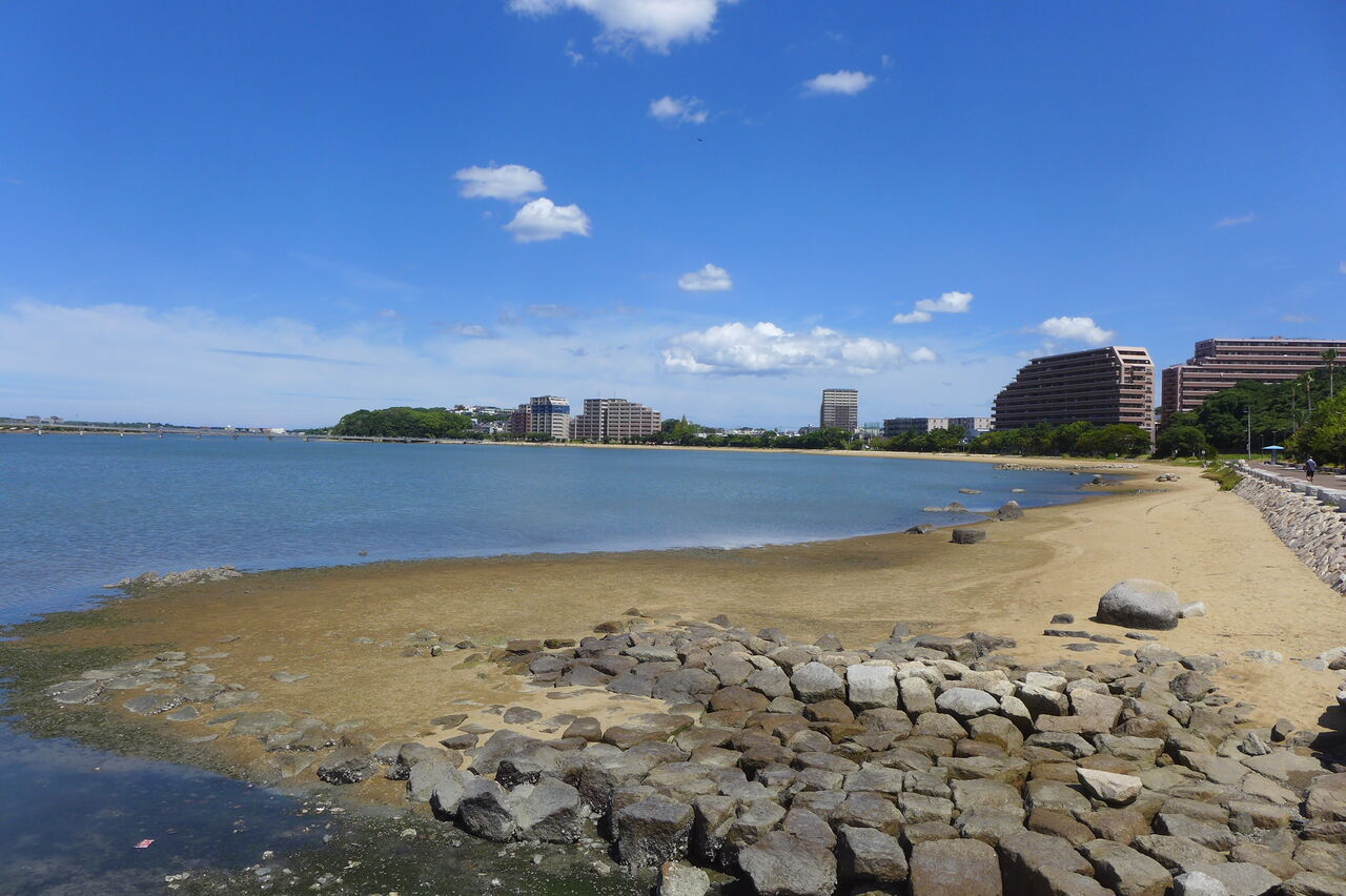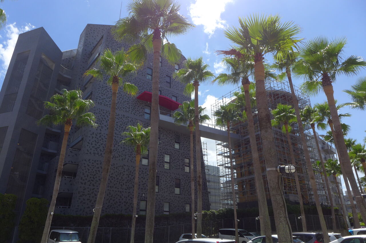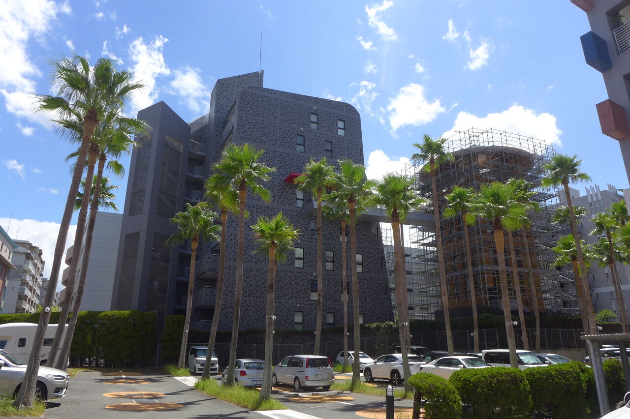 20240826香椎浜の灼熱散策路とネクサスワールド・ポルザンパルク棟改修壁が眩しい
