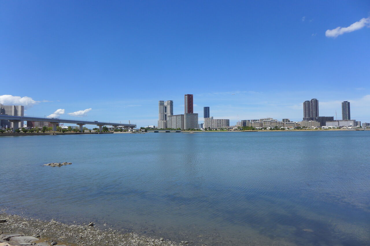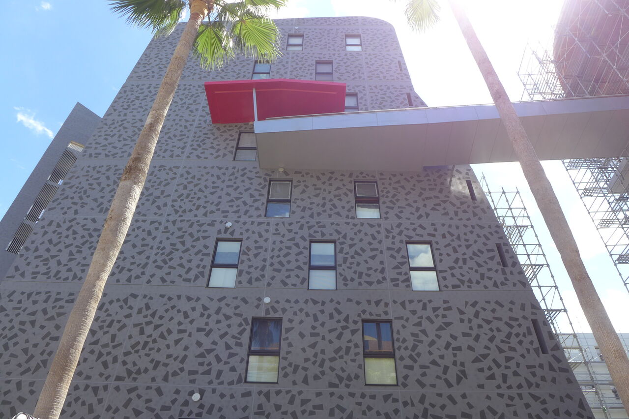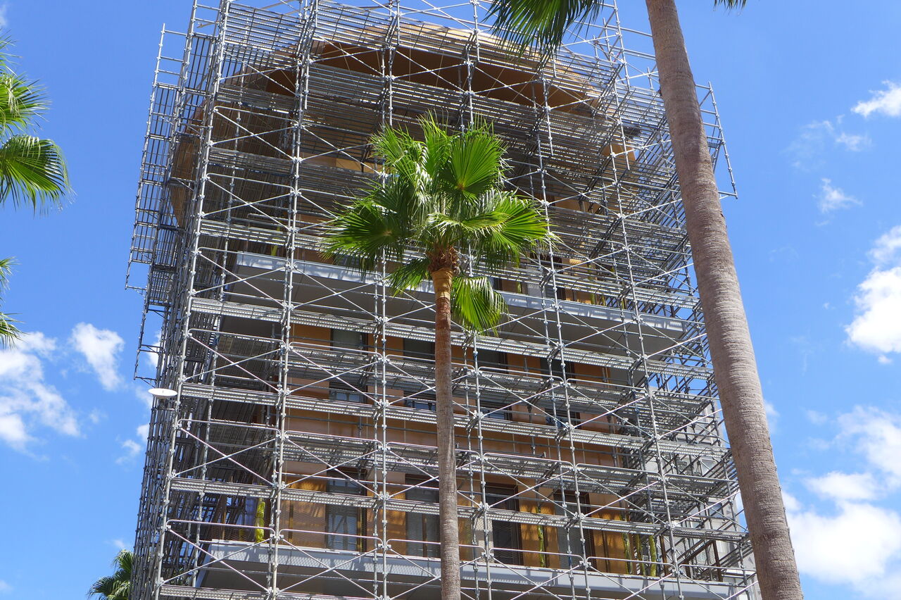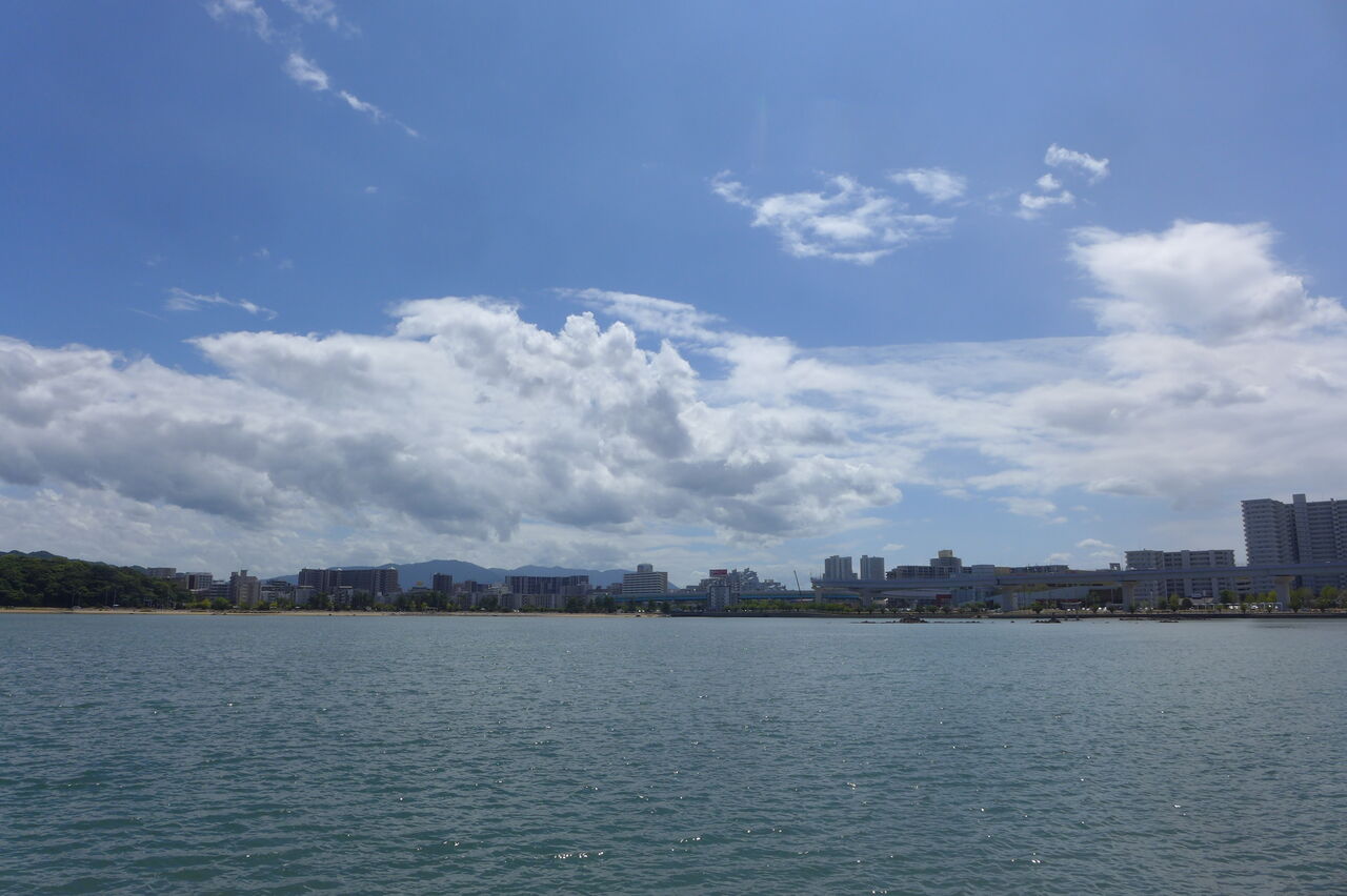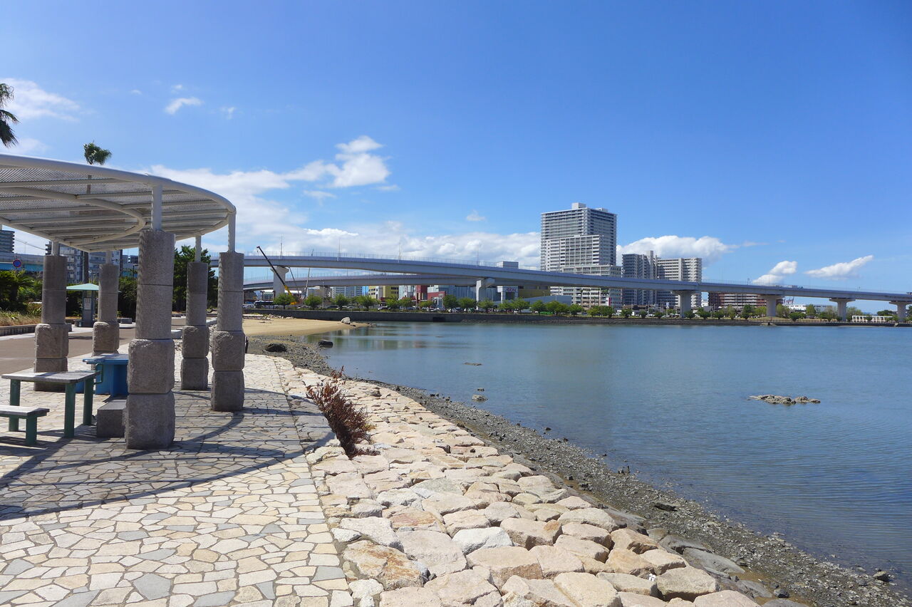 20240826香椎浜の灼熱散策路とネクサスワールド・ポルザンパルク棟改修壁が眩しい