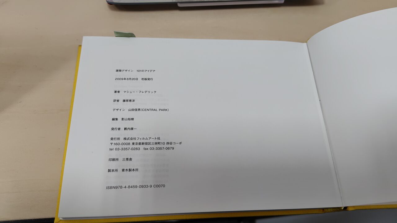 入ってすぐに本の陳列が目に入り、なぜか、黄色い表紙のひとつだけ小さい本に目が行き、手に取って、中身を見て、良い本だなと思い、著者を確認したところ、藤原先生訳の『建築デザイン 101のアイデア』だとわかりました。非常に驚きながらも、初めて見たこの本が建築デザインの示唆に富む良い本だと認識いたしました。