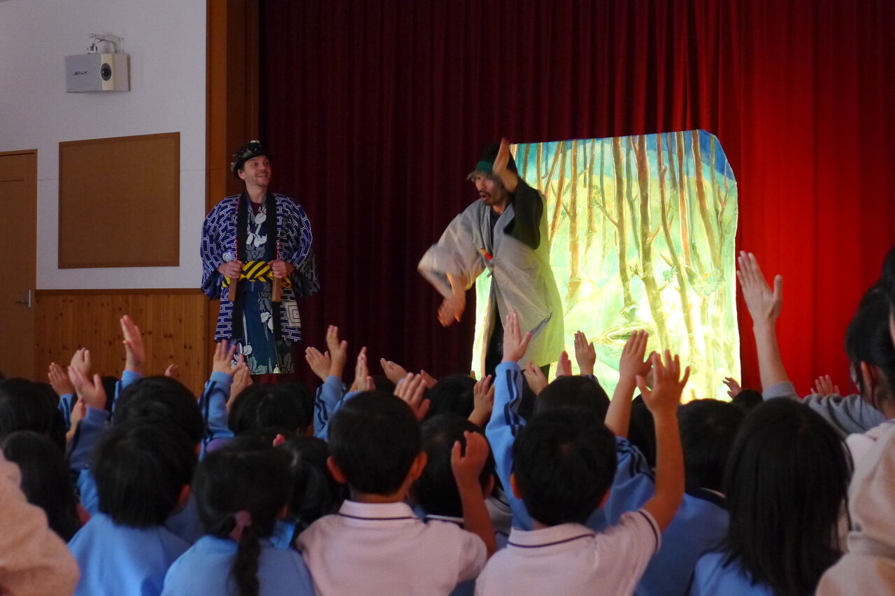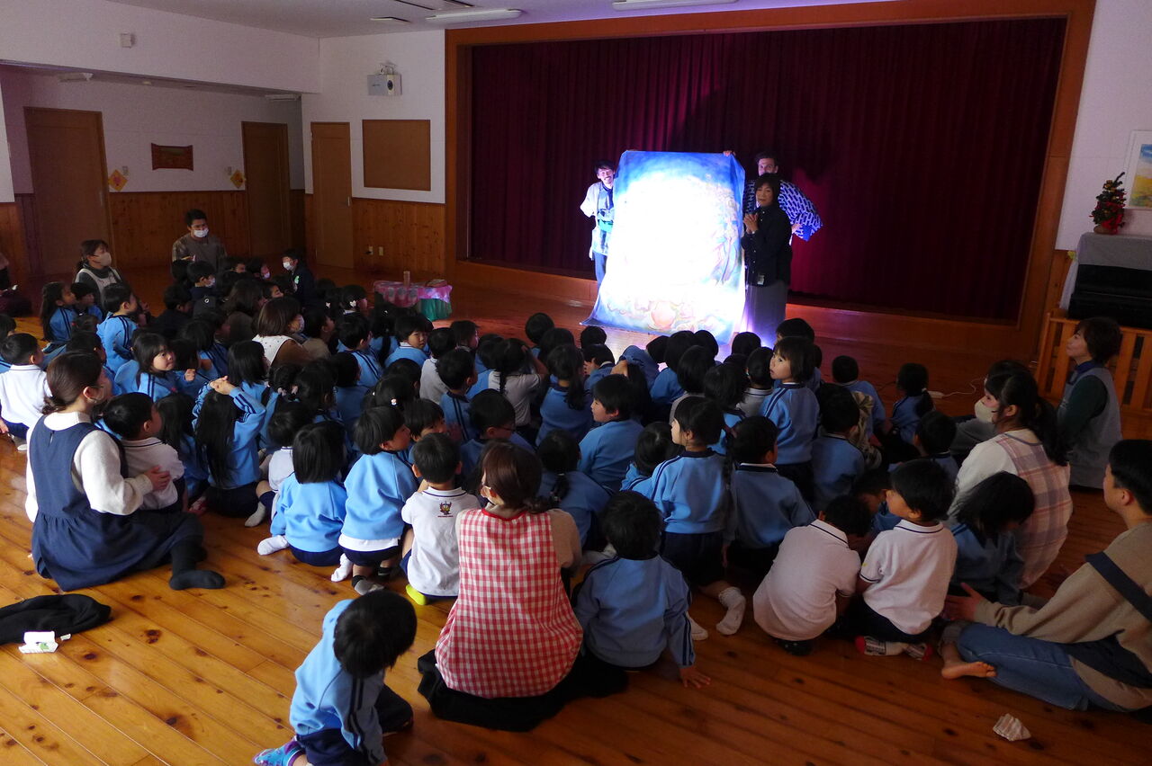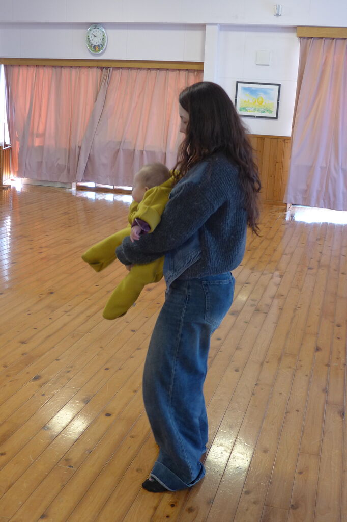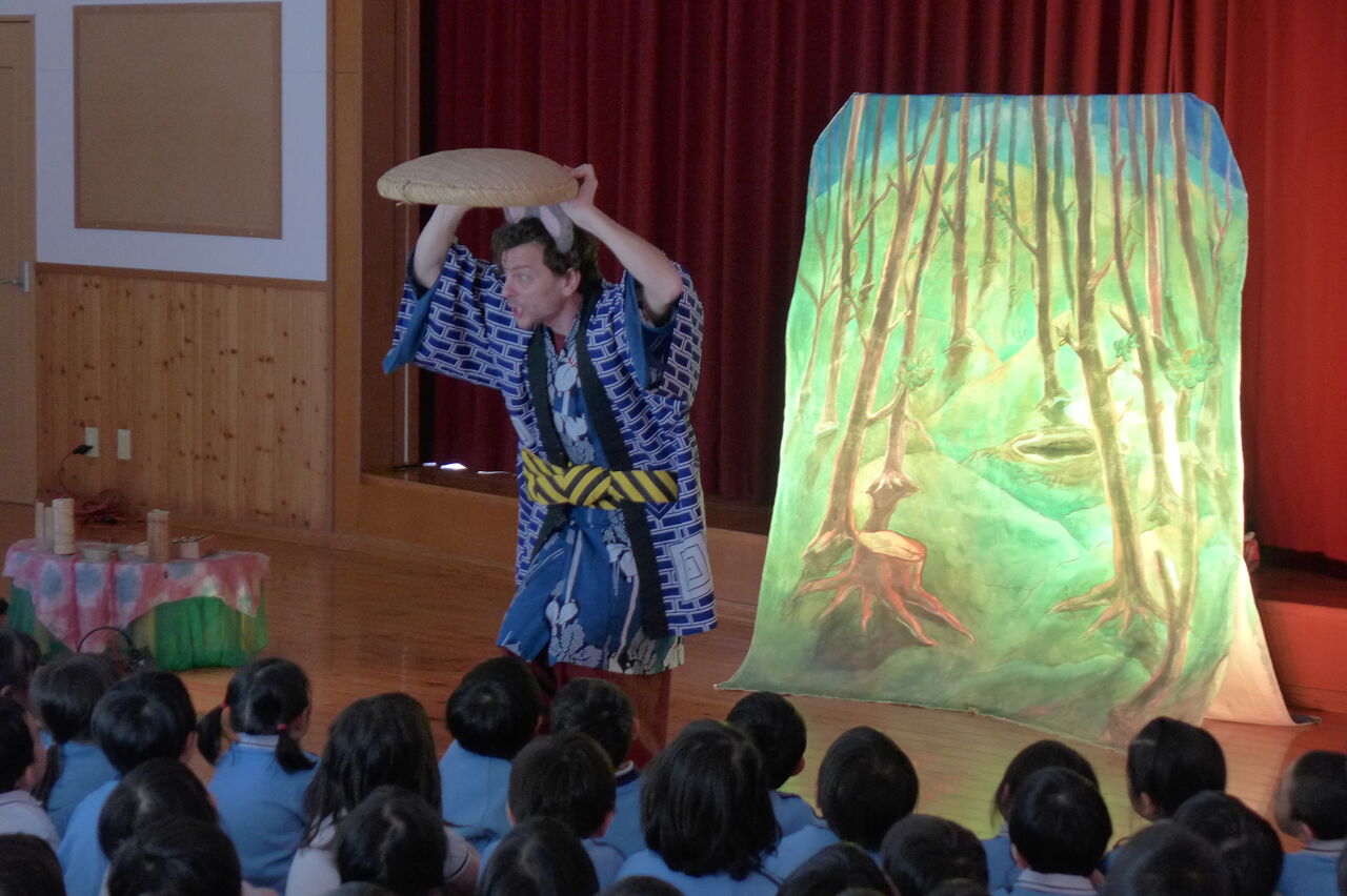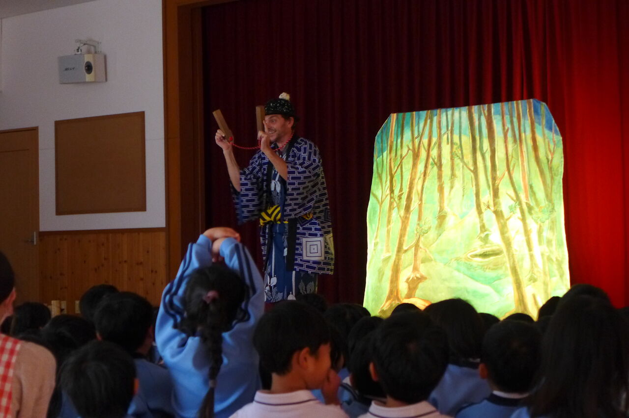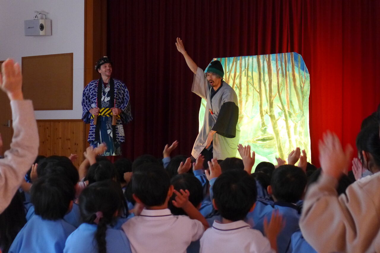 20241217佐々木泰佑・Flavia Tomescu・Alexandru Tudor Sabau 日本語とルーマニア語を交えての「おむすびころりん」オイリュトミー劇!子どもたち大歓声!!佐賀市諸富こども園にて