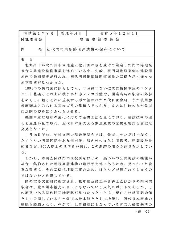20241201 北九州市議会建設建築委員会へ陳情「初代門司港駅跡関連遺構の保存について」