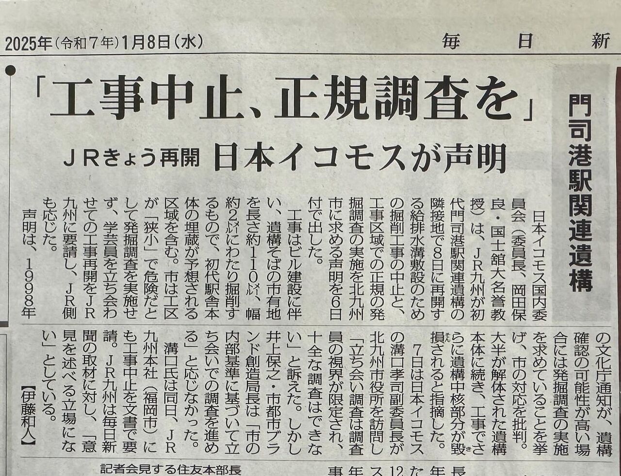 20250107毎日新聞 門司港駅関連遺構 工事中止、正規調査を JRきょう再開 日本イコモスが声明