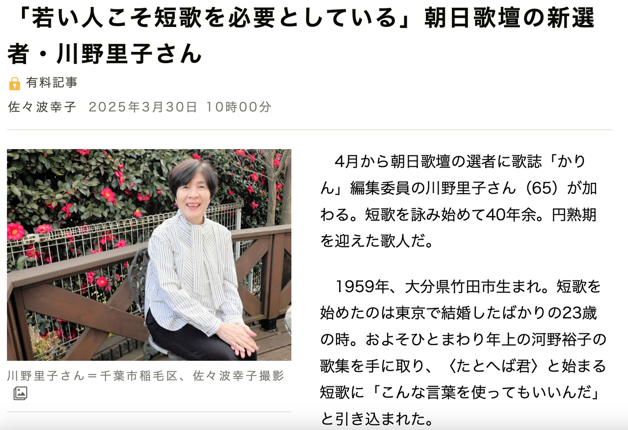 朝日新聞 2025年3月30日(日)朝刊・文化欄にて、新年度の朝日歌壇選者になられた川野里子先生のお姿を拝見!