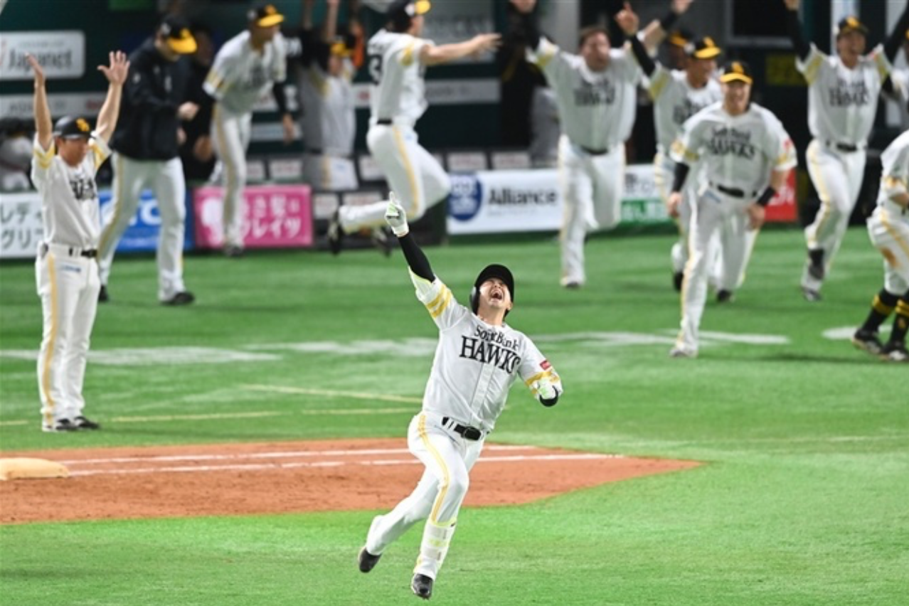 9回2死満塁、サヨナラ2点二塁打を放ち喜ぶ代打・川瀬(撮影・星野楽) - 【速報】ソフトバンクホークス、9回2死走者なしから大逆転サヨナラ勝ち 最後は代打・川瀬晃 - 写真・画像(1/4)