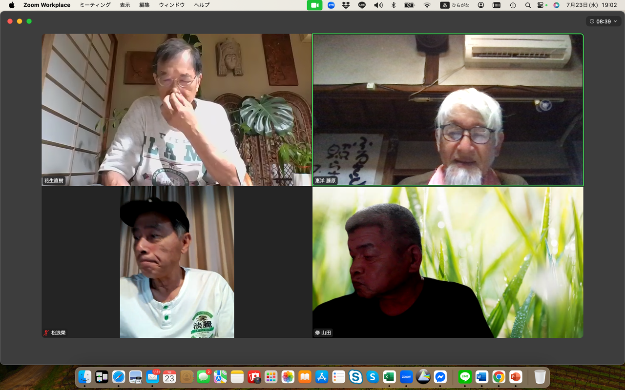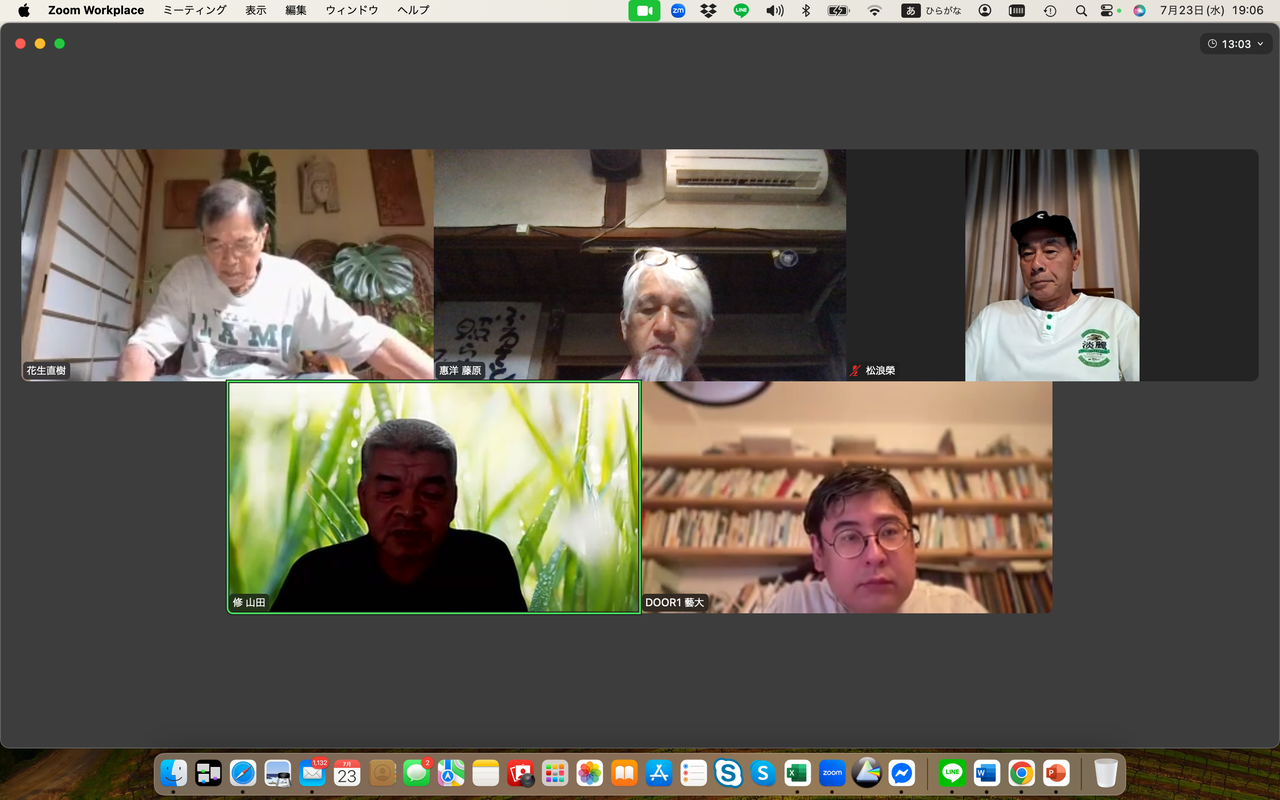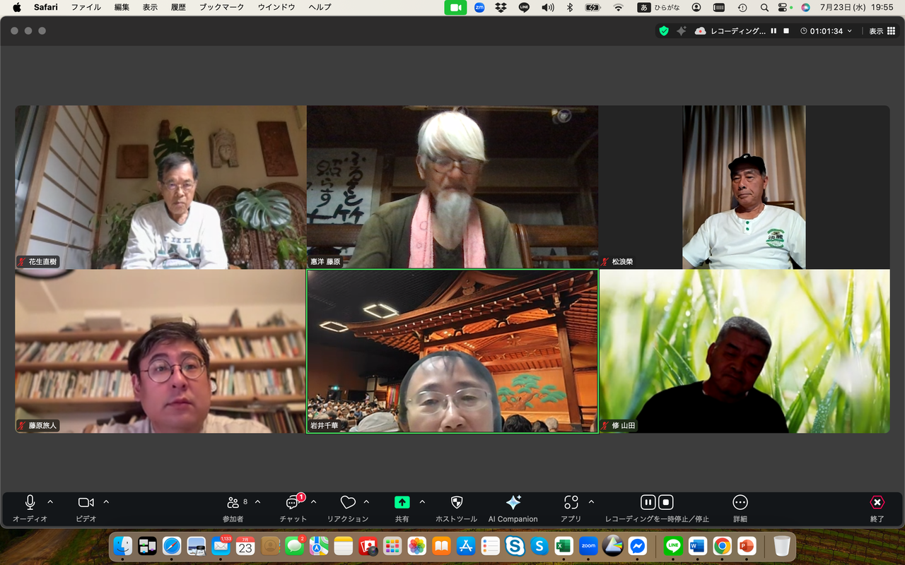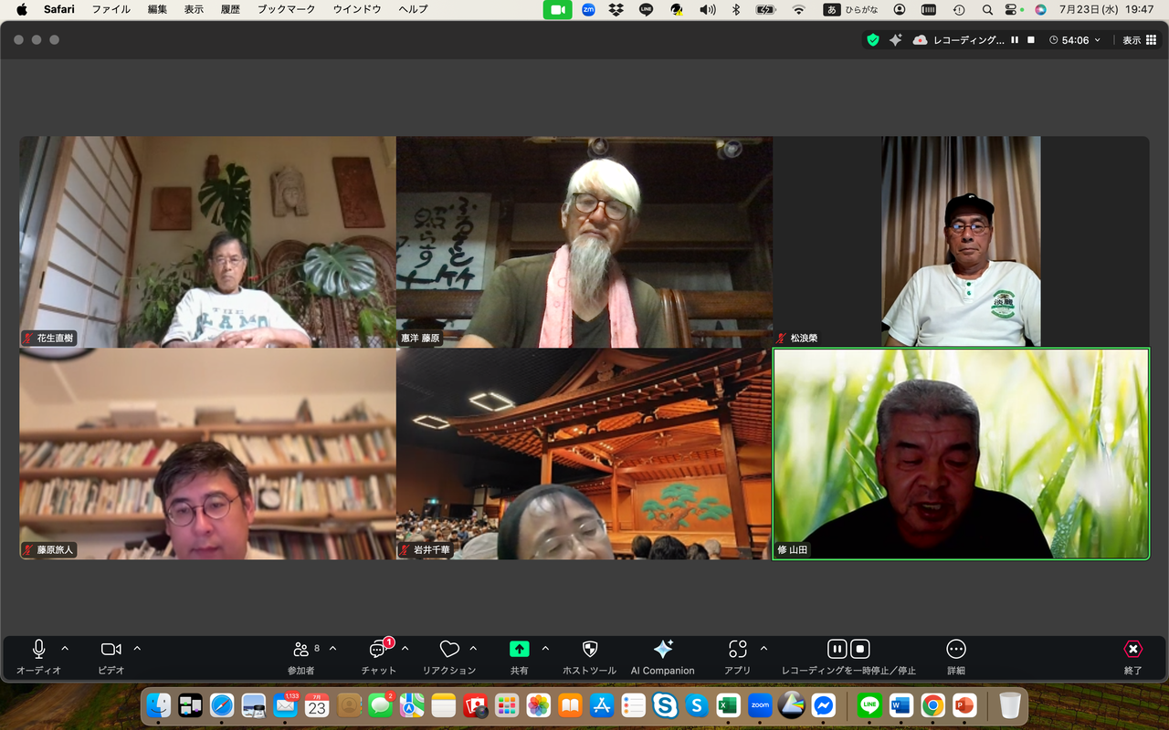 松浪榮は自然資本主義や公益資本主義の概念について関心を示す中、新たな民主主義のあり方を示した政党があった、それはチームみらいであり、その手法と新しい民主主義の思想について感想を述べた。一方、花生直樹は参政党の躍進と戦前的なイメージについて懸念を表明、むしろ大切な地域の伝統や自然の関係を取り違えては行けない、と話した。岩井千華は小山市での選挙の結果と投票者の動向について分析。若い世代が政治に興味を示さない理由は権力闘争が見えるからだと指摘した。藤原旅人はSNSの活用と選挙の不透明性について言及した。河村一郎は地元が保守王国の山口だからこそ国民を欺き続けた自民党が大敗したことがクリアに見えると指摘、日々無農薬でのイネづくりには草取りが欠かせない、手仕事で草を取り除くことについて意義を語った。