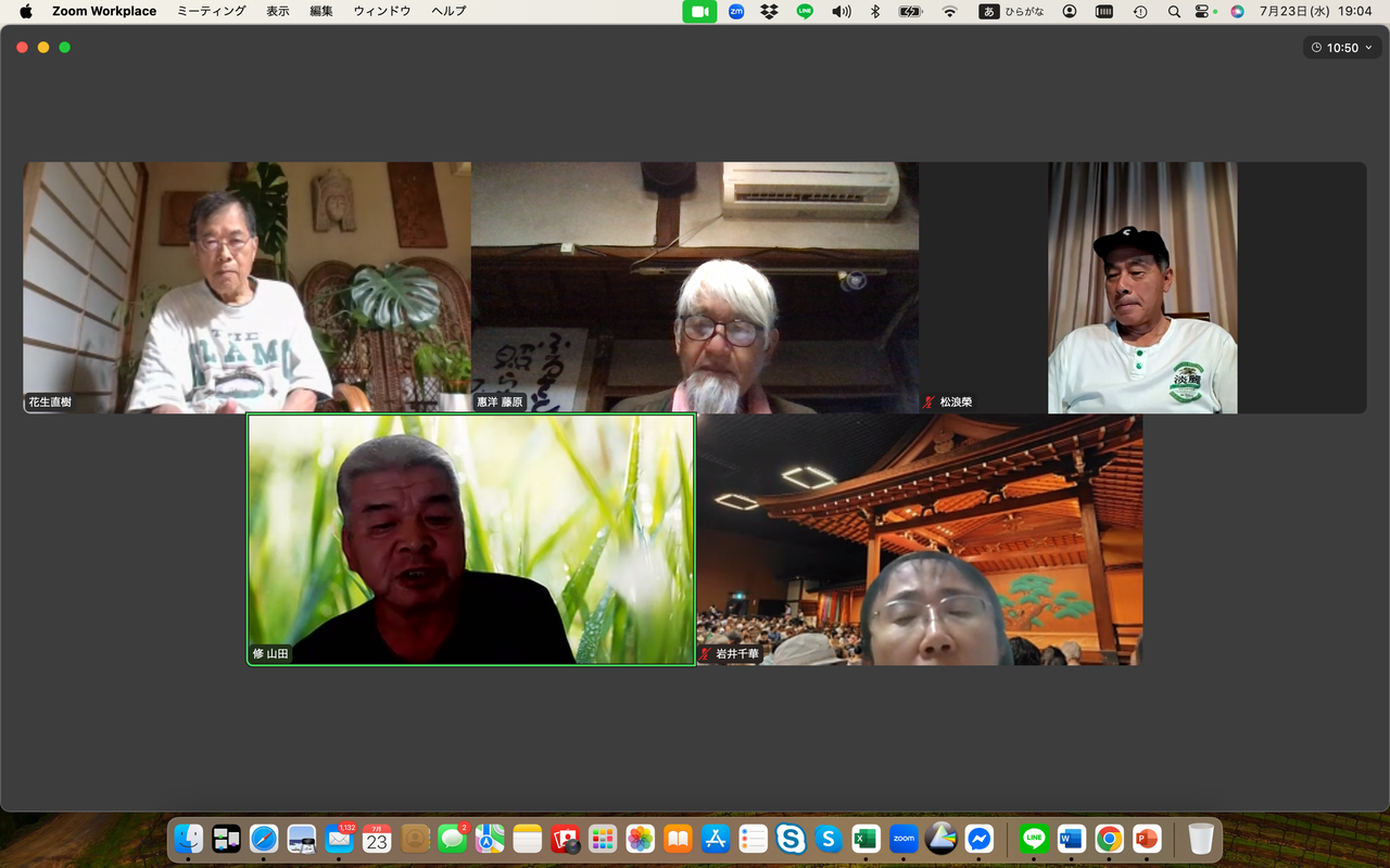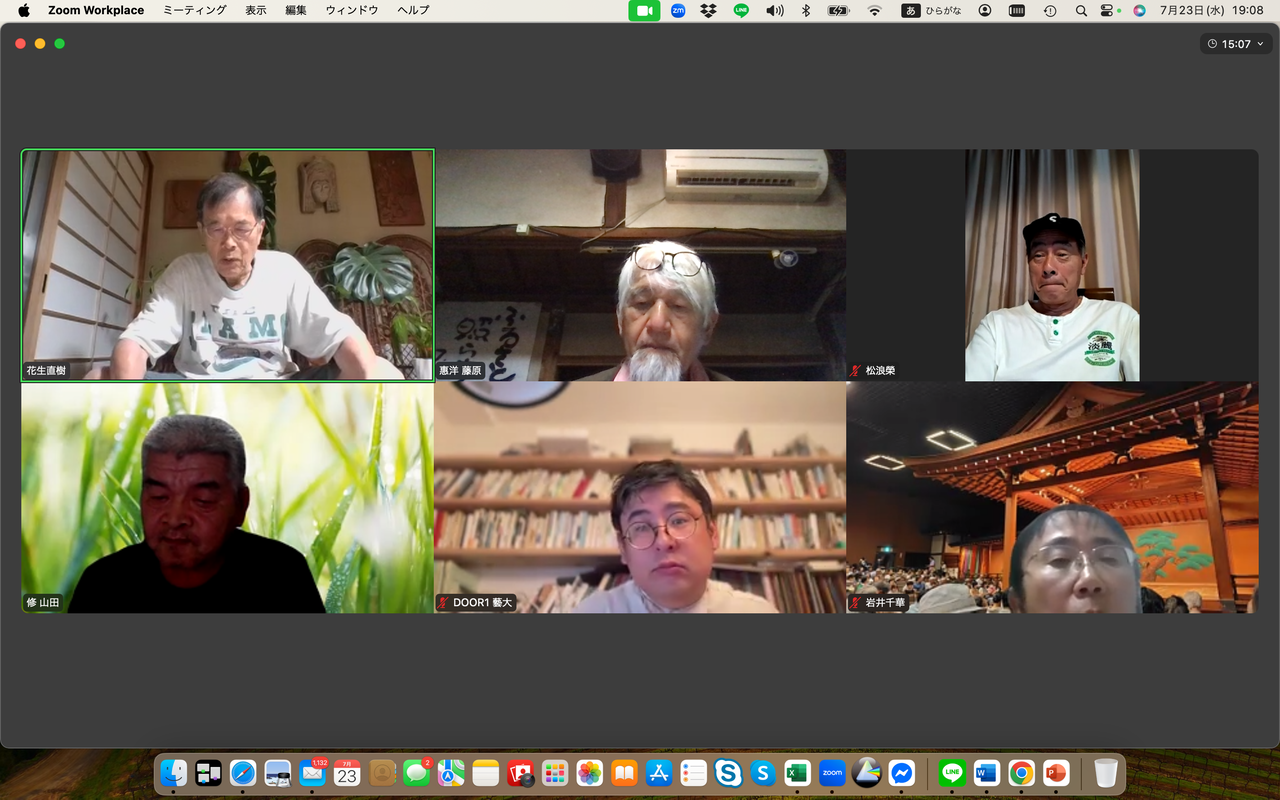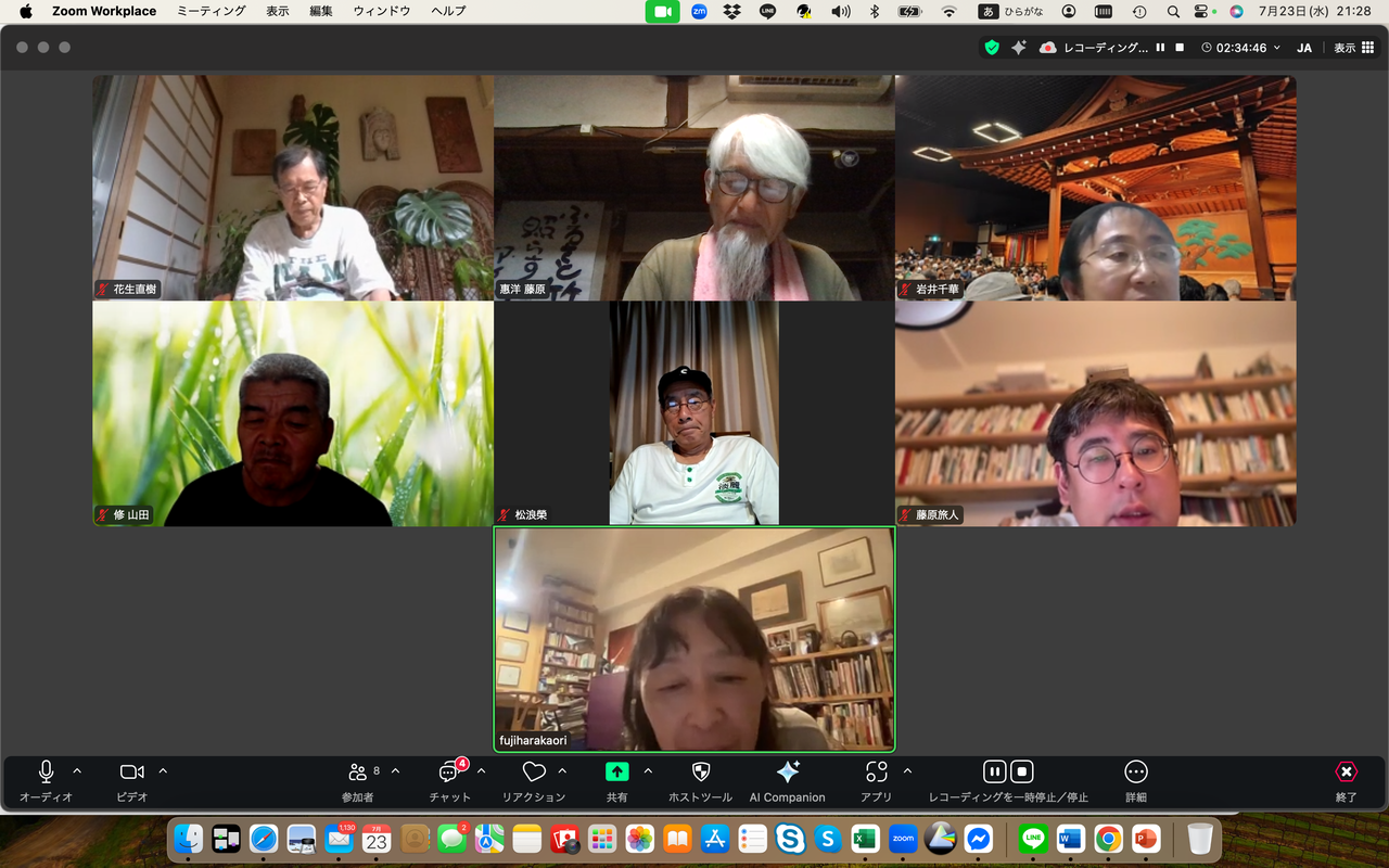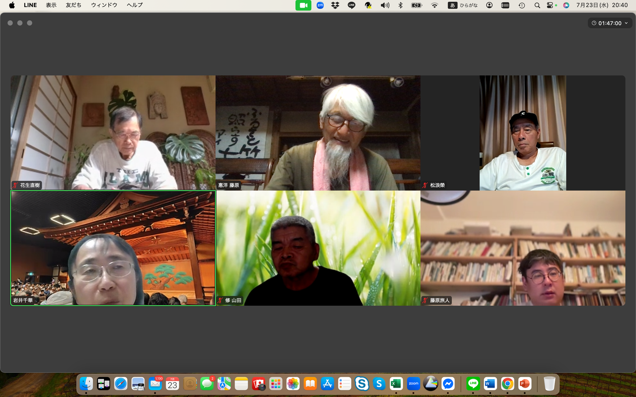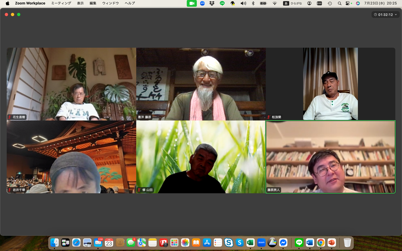 松浪榮は自然資本主義や公益資本主義の概念について関心を示す中、新たな民主主義のあり方を示した政党があった、それはチームみらいであり、その手法と新しい民主主義の思想について感想を述べた。一方、花生直樹は参政党の躍進と戦前的なイメージについて懸念を表明、むしろ大切な地域の伝統や自然の関係を取り違えては行けない、と話した。岩井千華は小山市での選挙の結果と投票者の動向について分析。若い世代が政治に興味を示さない理由は権力闘争が見えるからだと指摘した。藤原旅人はSNSの活用と選挙の不透明性について言及した。河村一郎は地元が保守王国の山口だからこそ国民を欺き続けた自民党が大敗したことがクリアに見えると指摘、日々無農薬でのイネづくりには草取りが欠かせない、手仕事で草を取り除くことについて意義を語った。