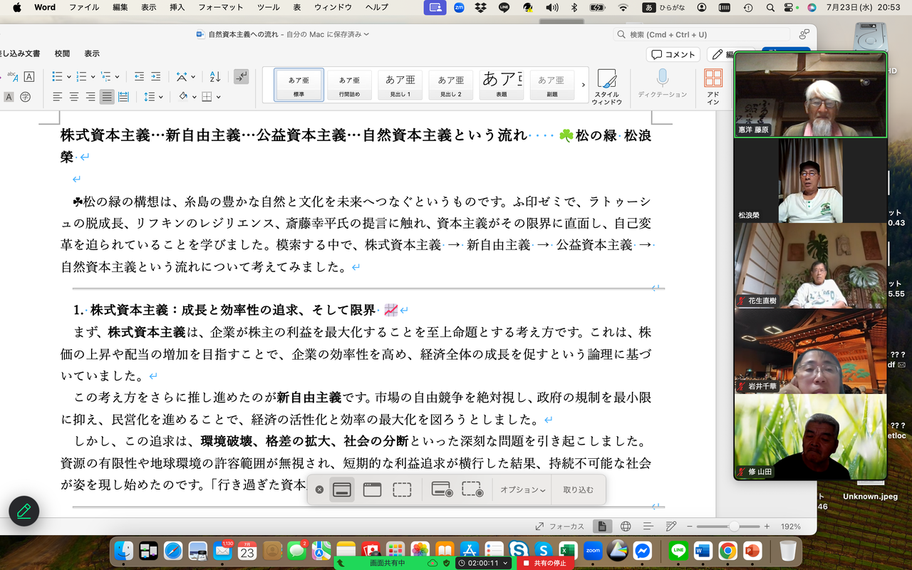 松浪レジュメを元に、松浪は資本主義の変遷について振り返り、自然資本主義への関心を共有した。最後に、花生が愛読する毎日新聞が徹底した参政党問題へフォーカスを当てながら展開した選挙報道に触れ、他の新聞メディアはどうだったのか、と質問、山田と藤原旅人がTBSの報道特集や朝日新聞の社説へ共感を示した。岩井は人類が平和な時代に恵まれたことへの疑問を提起し、藤原馨はガンジーの著作から「人間の体は宇宙のミニチュアである」という考えに感銘を受けたと強調した。