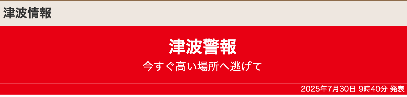 7月30日(水)10:00 津波警報が発令されています!!津波注意!!