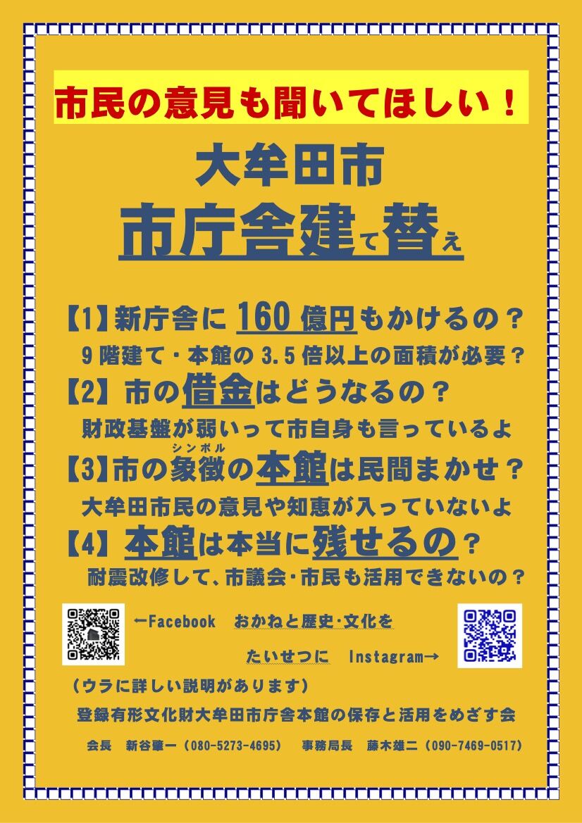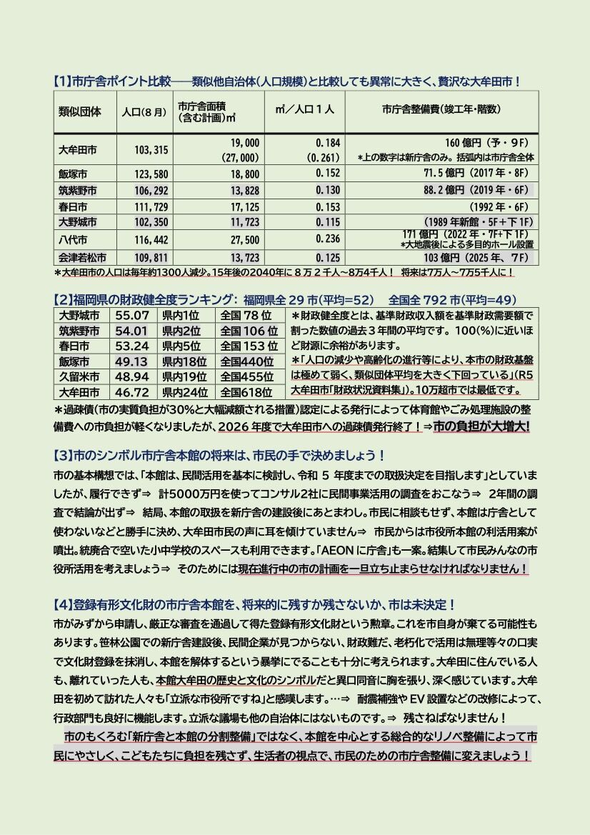 めざす会(代表新谷肇一先生)より2025年11月大牟田市議会報告会へ市民参加時に参照できる大牟田市役所本庁舎保存・建て替え問題チラシが届きました!