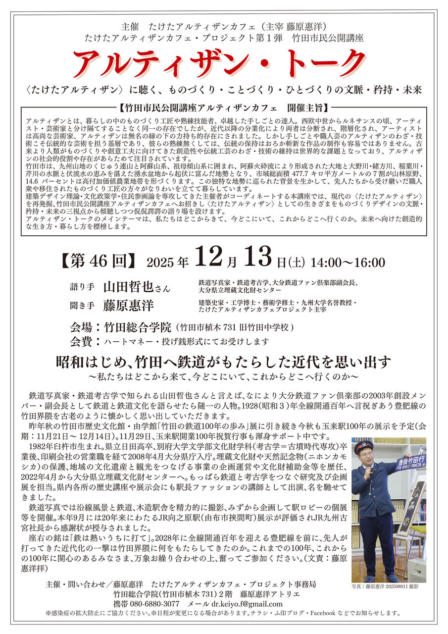 1928(昭和3)年に全線開通した豊肥本線はあと3年で百周年。大分県側の豊後大野市〜竹田市に点在する駅舎100周年記念を呼びかけながら地元と協力しあって大分鉄道ファン倶楽部副会長の山田哲也さんが奮闘中。昨年秋には竹田市歴史文化館・由学館にて豊後竹田駅開設百周年を言祝ぐ展示会を主催!今年も玉来駅開設百周年を祝う事業を玉来地区住民の方々と展開中!そんな鳥瞰と虫瞰の複眼思考の山田哲也さんを竹田市民公開講座アルティザン・トークへお招きして対談いたします。題して「昭和はじめ、竹田へ鉄道がもたらした近代を思い出す」。12月13日(土)午後、会場は竹田総合学院TSG。万障お繰り合わせうえ奮ってご参加ください。藤原惠洋@アルティザンカフェ・プロジェクト主宰