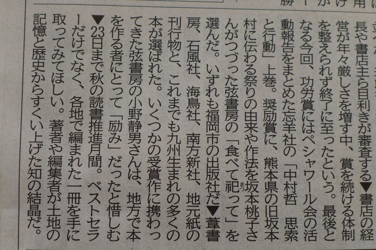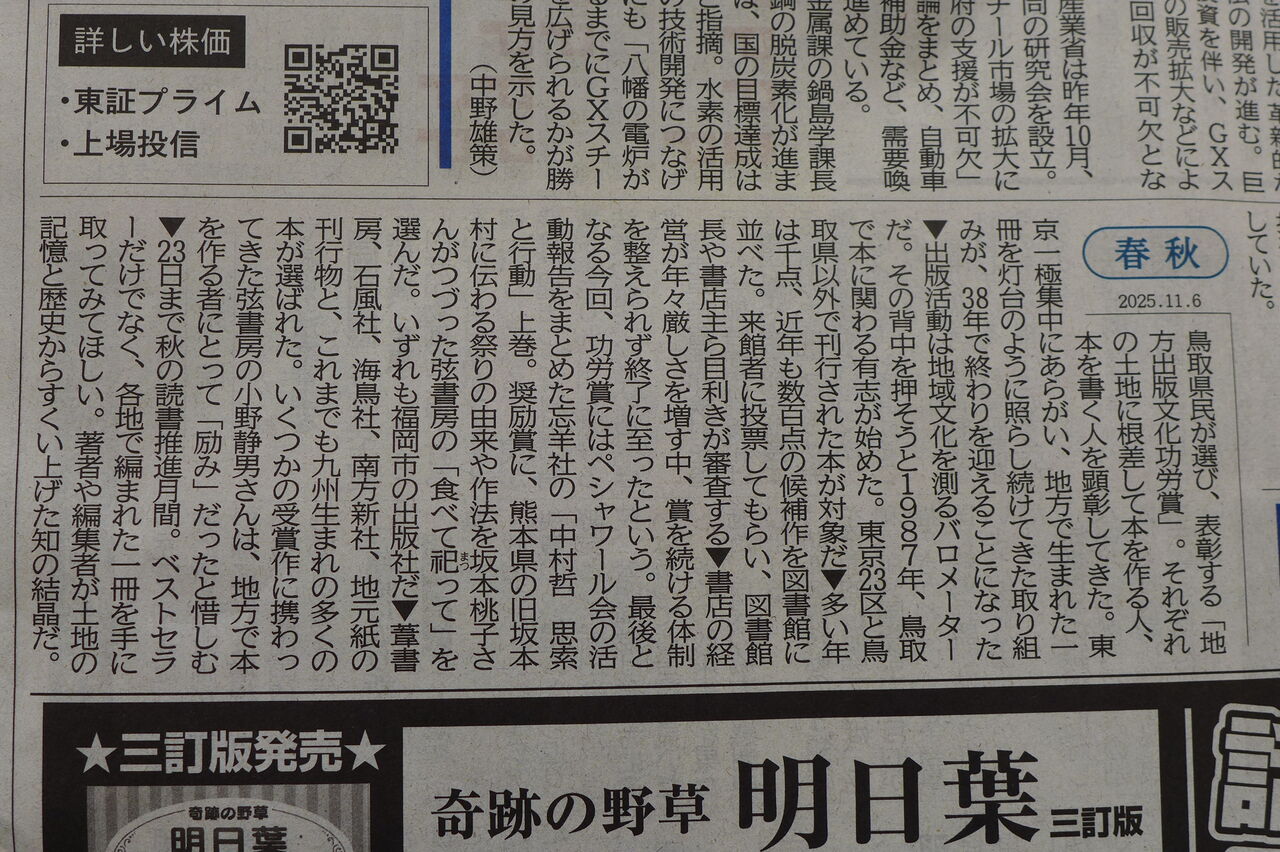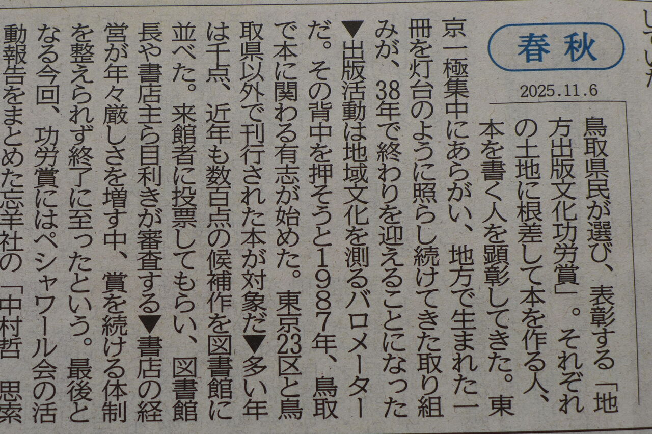 20251106西日本新聞「春秋」が鳥取県民によって始められた地方出版文化功労賞事業の取りやめを嘆いている!