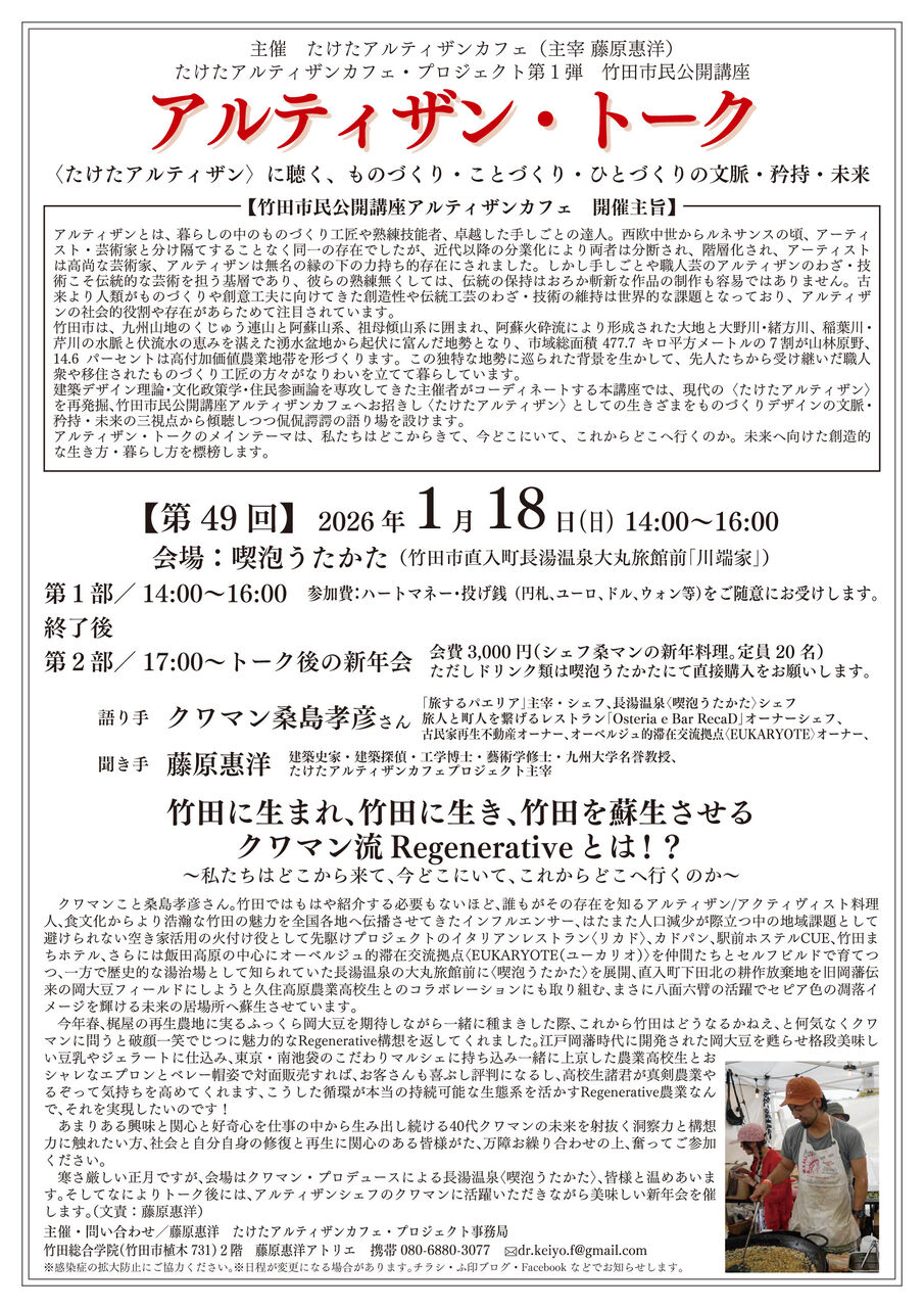 寒さ厳しい正月ですが、会場はクワマン・プロデュースによる長湯温泉〈喫泡うたかた〉、皆様と温めあいます。そしてなによりトーク後には、アルティザンシェフのクワマンに活躍いただきながら美味しい新年会を催します。(文責:藤原惠洋)