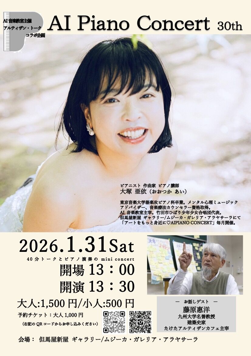 ピアニスト大塚亜依さんが竹田城下町の但馬屋新屋ギャラリー/ムジーカ・ガレリア・アラヤサーラで続けるAI PIANO CONCERTは、2025年1月31日(土)に記念すべき第30回。「ARTをもっと身近に♡」“人×音楽を繋ぐコンサート”を目指し多くのファンを魅了、こどもから大人までときめくひとときを創出してきました。