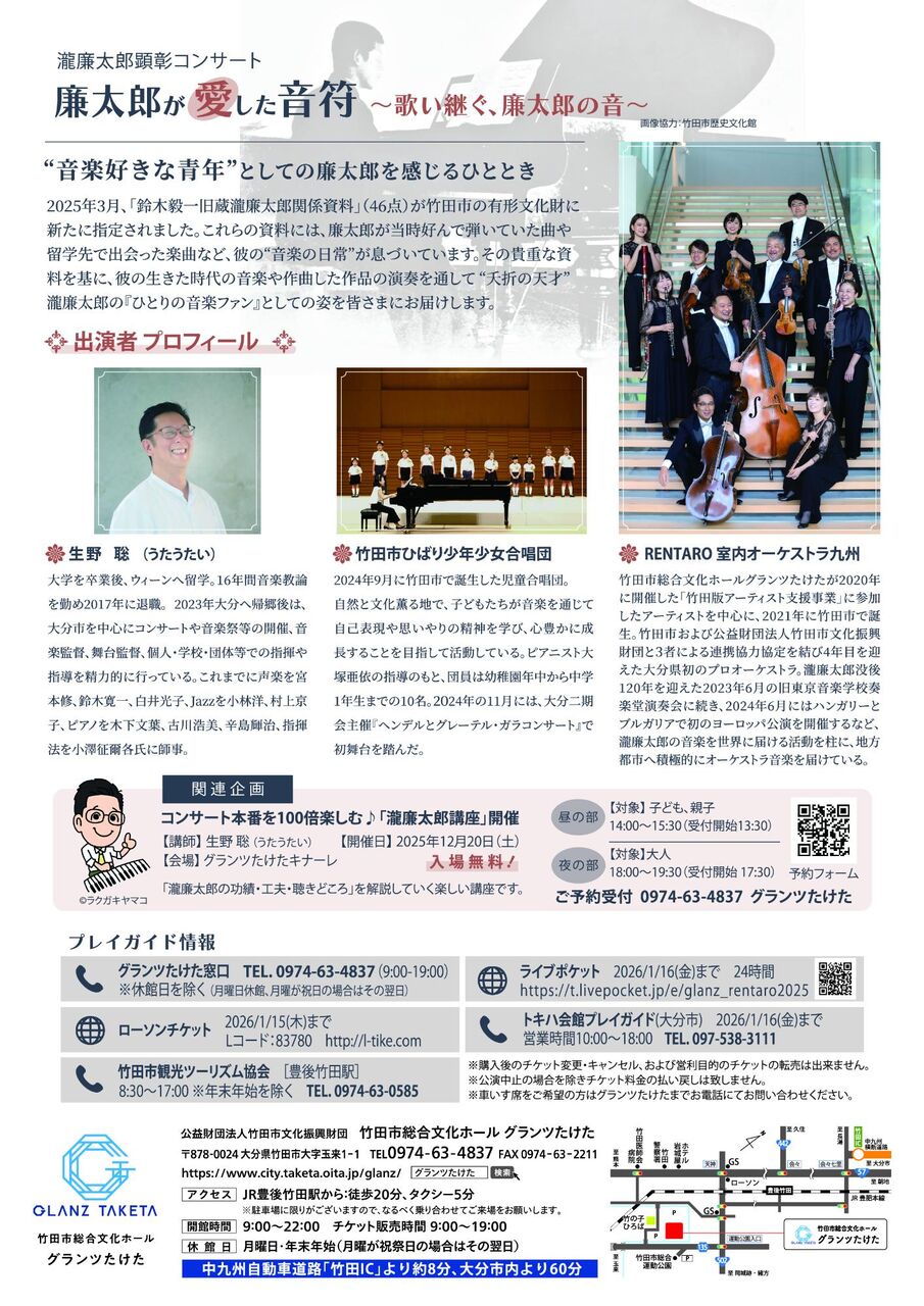 グランツたけたでは、2026年1月17日(土曜日)に瀧廉太郎顕彰コンサート「廉太郎が愛した音符」を開催します。
