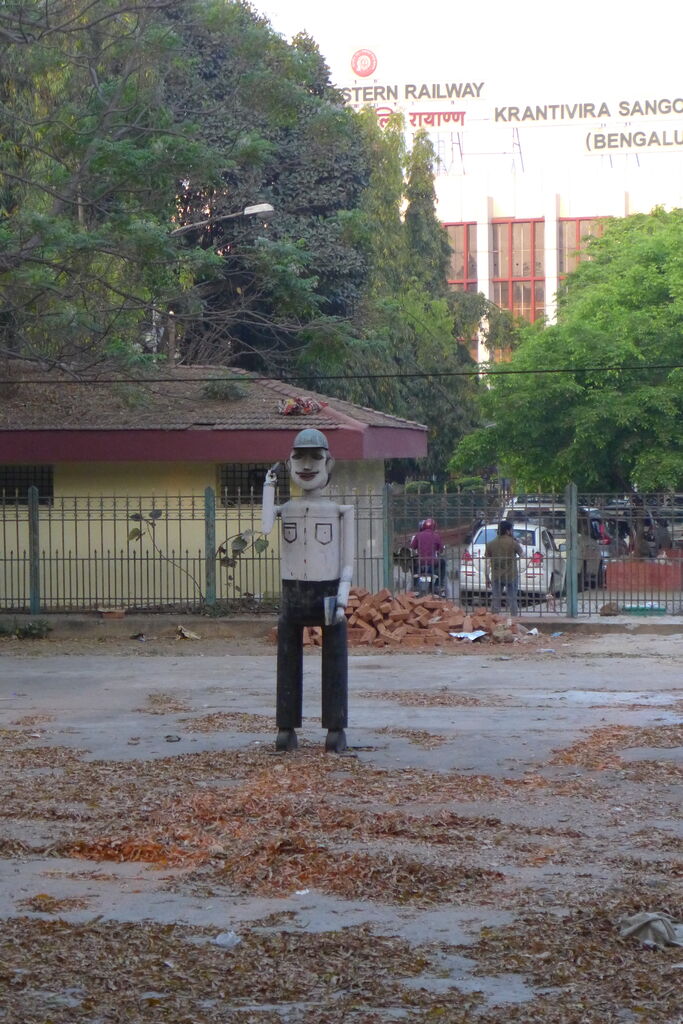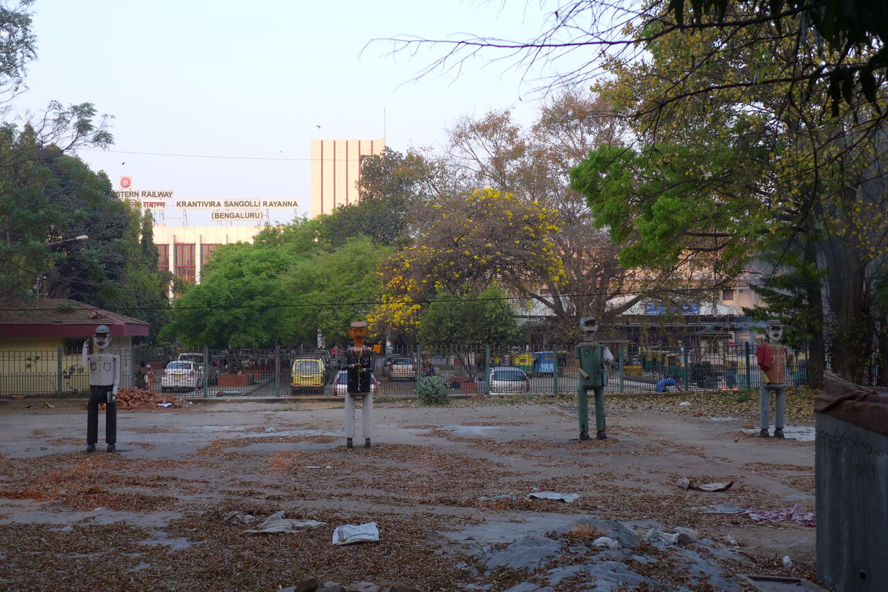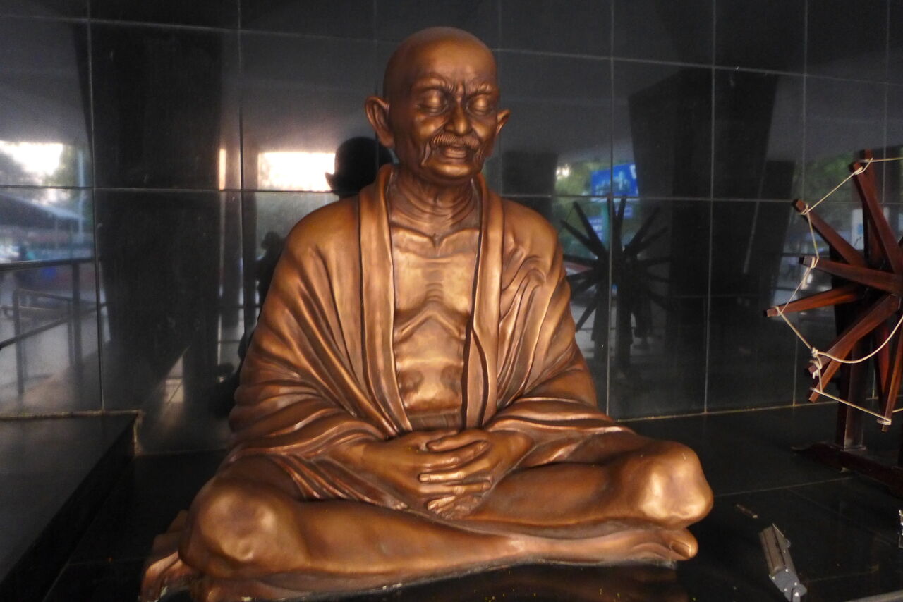 バンガロールジャンクション駅前にもガンジー翁とチャルカのイコンが設置されている。